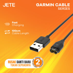 Untuk pengguna smartwatch Garmin, JETE menyediakan kabel charger khusus yang dirancang agar kompatibel dengan berbagai seri Garmin. Kabel ini mendukung fast charging dengan waktu pengisian sekitar dua jam.