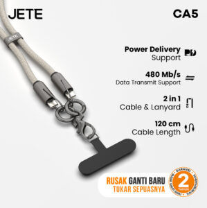 JETE CA5 65W hadir dengan konsep unik sebagai kabel data sekaligus lanyard. Desain ini sangat membantu pengguna aktif yang ingin tetap mengisi daya sambil membawa perangkat dengan aman. Kabel ini mendukung fast charging hingga 65W untuk Type C dan 30W untuk Lightning.