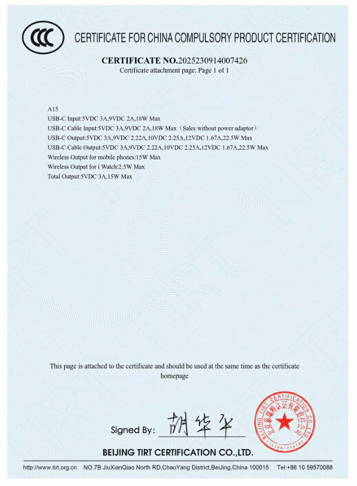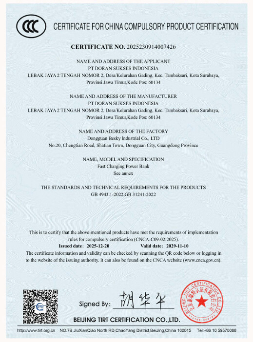 Powerbank JETE A15 kini telah bersertifikasi CCC, menandakan bahwa produk telah diuji dan disetujui sesuai regulasi nasional untuk menjamin keamanan pengguna. Sertifikasi CCC merupakan standar wajib dari pemerintah Tiongkok yang memastikan produk telah memenuhi persyaratan keselamatan, kualitas, dan perlindungan lingkungan sebelum dapat dipasarkan di Tiongkok.