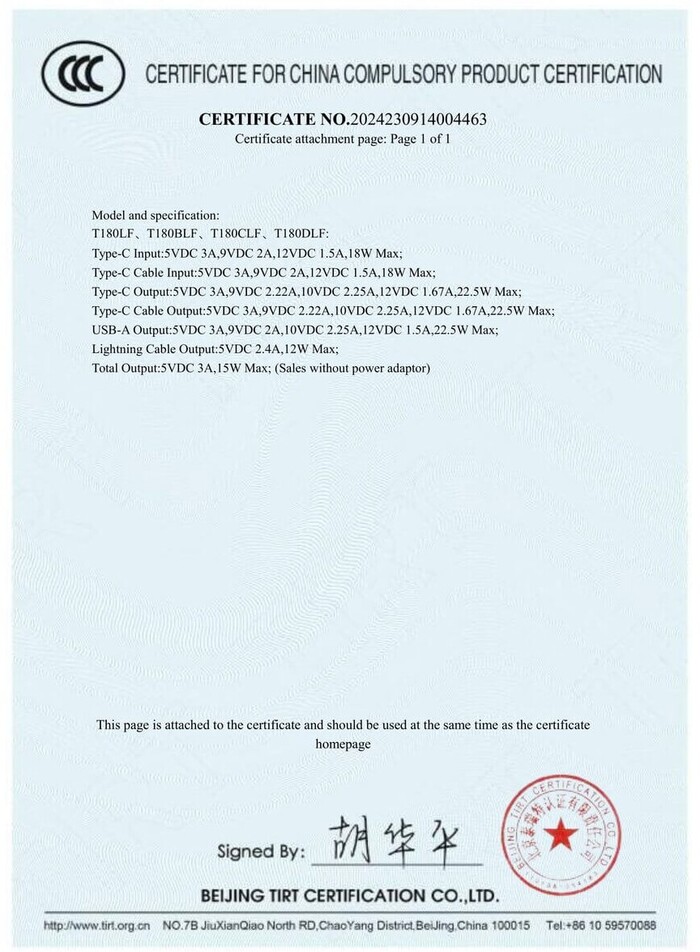 Powerbank JETE B7 20K kini telah bersertifikasi CCC, menandakan bahwa produk telah diuji dan disetujui sesuai regulasi nasional untuk menjamin keamanan pengguna. Sertifikasi CCC merupakan standar wajib dari pemerintah Tiongkok yang memastikan produk telah memenuhi persyaratan keselamatan, kualitas, dan perlindungan lingkungan sebelum dapat dipasarkan di Tiongkok.
