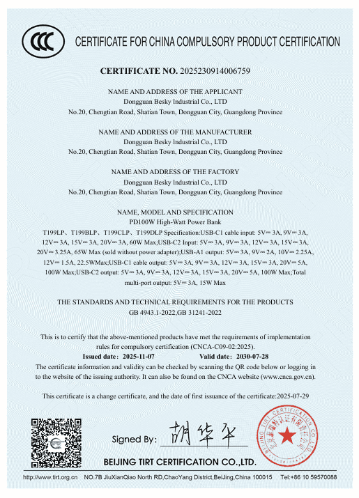 Powerbank JETE B7 25K kini telah bersertifikasi CCC, menandakan bahwa produk telah diuji dan disetujui sesuai regulasi nasional untuk menjamin keamanan pengguna. Sertifikasi CCC merupakan standar wajib dari pemerintah Tiongkok yang memastikan produk telah memenuhi persyaratan keselamatan, kualitas, dan perlindungan lingkungan sebelum dapat dipasarkan di Tiongkok.