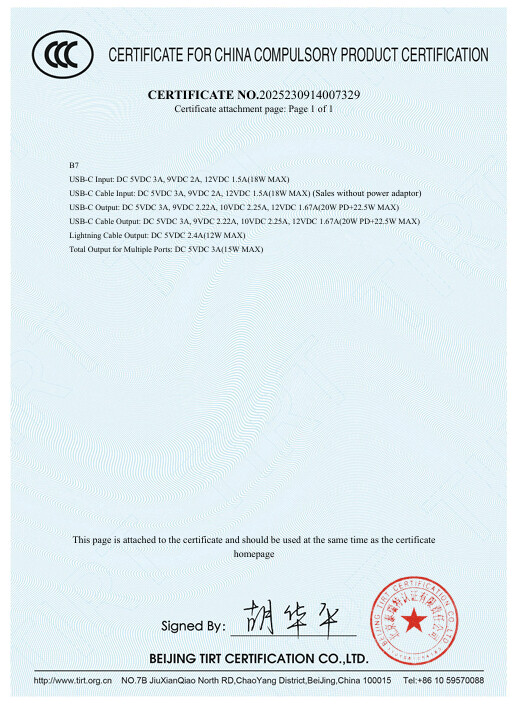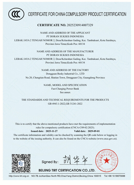 Powerbank JETE B7 kini telah bersertifikasi CCC, menandakan bahwa produk telah diuji dan disetujui sesuai regulasi nasional untuk menjamin keamanan pengguna. Sertifikasi CCC merupakan standar wajib dari pemerintah Tiongkok yang memastikan produk telah memenuhi persyaratan keselamatan, kualitas, dan perlindungan lingkungan sebelum dapat dipasarkan di Tiongkok.