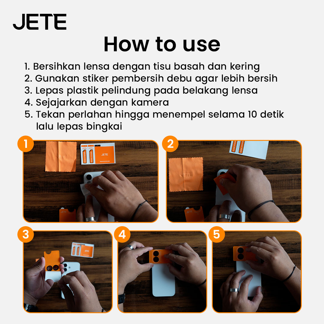 Pasang pelindung lensa hanya dalam lima langkah mudah. Dalam setiap pembelian sudah dilengkapi fitur pendukung untuk pemasangan. Mulai dengan membersihkan lensa hingga pasang dan tekan dalam hitungan 10 detik saja.