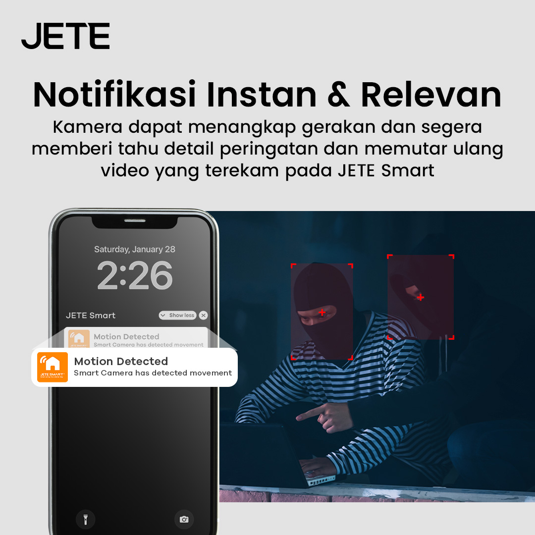 Dilengkapi fitur Motion Detection pintar, CCTV JETE CT5 siap siaga memantau setiap sudut ruanganmu. Saat ada gerakan tak biasa, sistem langsung mengirimkan notifikasi real-time ke smartphone, memastikanmu bebas rasa khawatir kapan pun, di mana pun. Tak hanya praktis, tapi juga memberi rasa aman sepanjang hari.