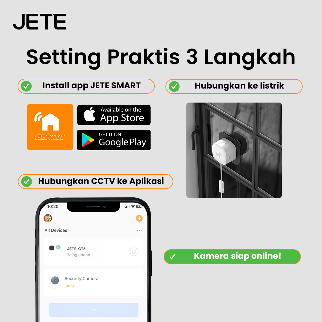 Pemasangan kamera pengawas JETE CT5 sangat mudah, cepat, dan praktis. Kamu hanya memerlukan tiga langkah mudah saja. Mulai dari install aplikasi JETE Smart di smartphone, pasangkan perangkat CCTV ke sumber daya listrik, lalu sambungkan ke aplikasi. Tunggu beberapa saat hingga benar-benar tersambung dan siap untuk digunakan.