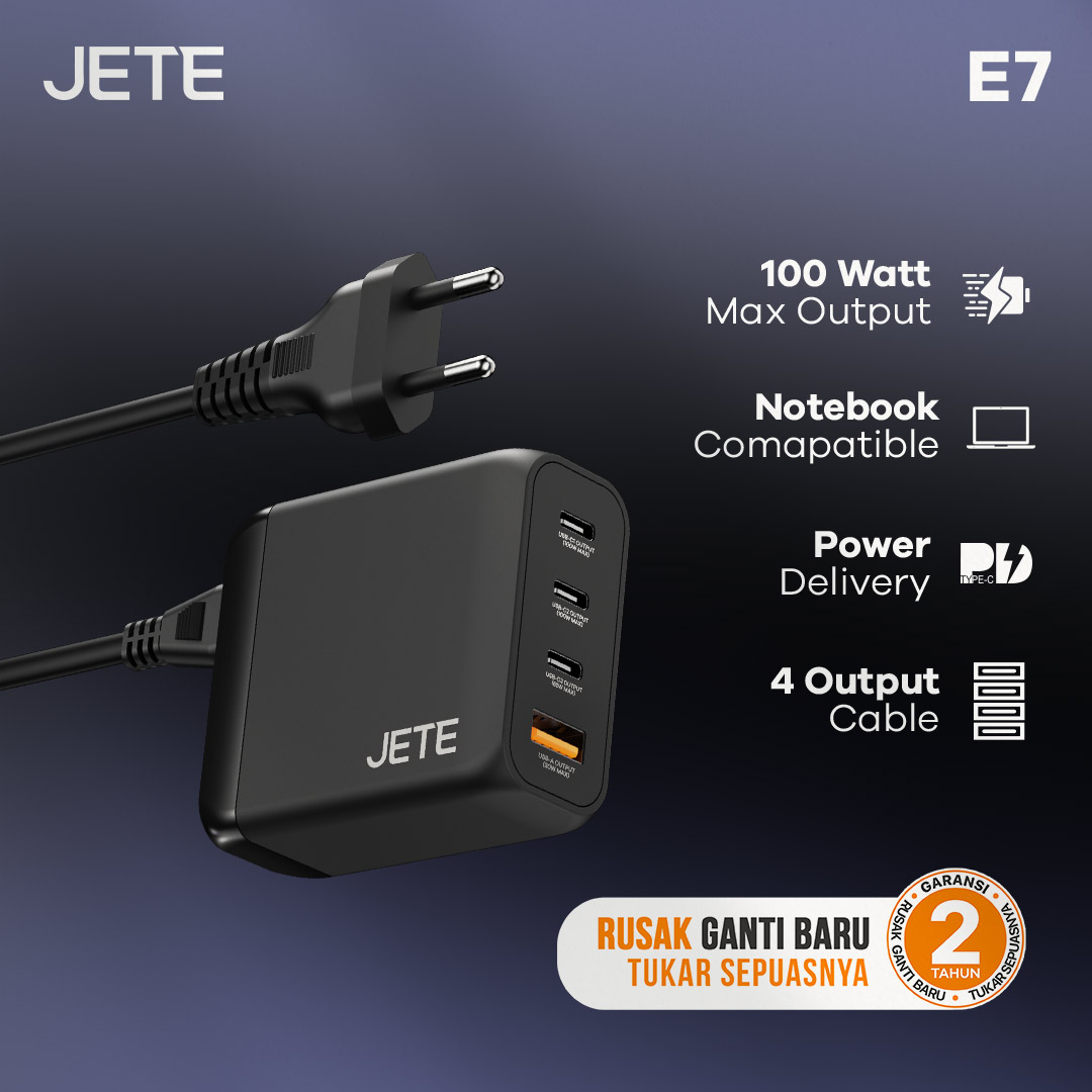Charger JETE E7 Series direkomendasikan untuk pengguna gadget dengan mobilitas tinggi. Dilengkapi port charger yang beragam, fitur keamanan yang lengkap, dan daya yang besar untuk pengisian lebih efisien, praktis, aman, dan nyaman.