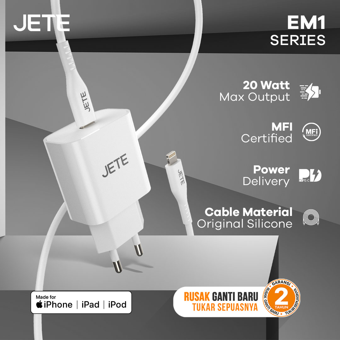 JETE EM1 Series adalah charger yang tepat untuk perangkat produk Apple Anda. Mulai dari iPhone, iPad, dan iPod. Dengan fitur pengisian daya cepat , fitur keamanan pengisian daya, dan sertifikasi MFi membuat Anda nyaman sepanjang hari. Baik untuk mendukung aktivitas kerja maupun menikmati konten favorit