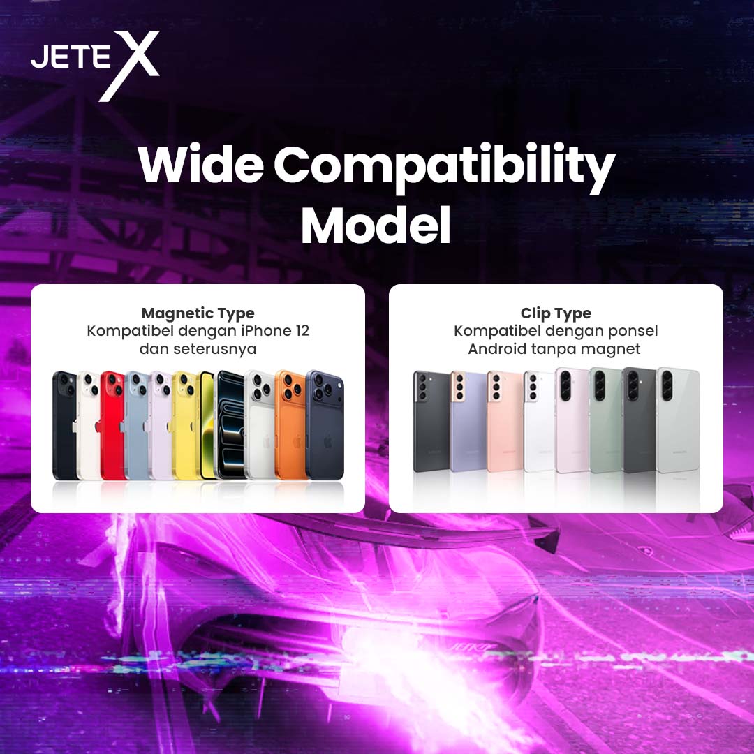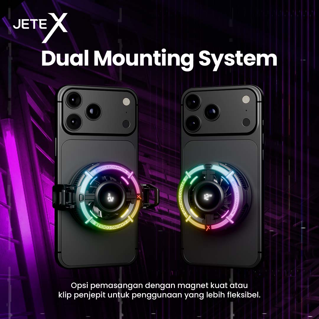 JETE-X PX2 mendukung penggunaan pada beragam tipe smartphone melalui pemasangan magnet atau klip. Satu aksesoris praktis yang bisa digunakan untuk banyak perangkat, sehingga lebih hemat dan efisien tanpa perlu cooler tambahan.