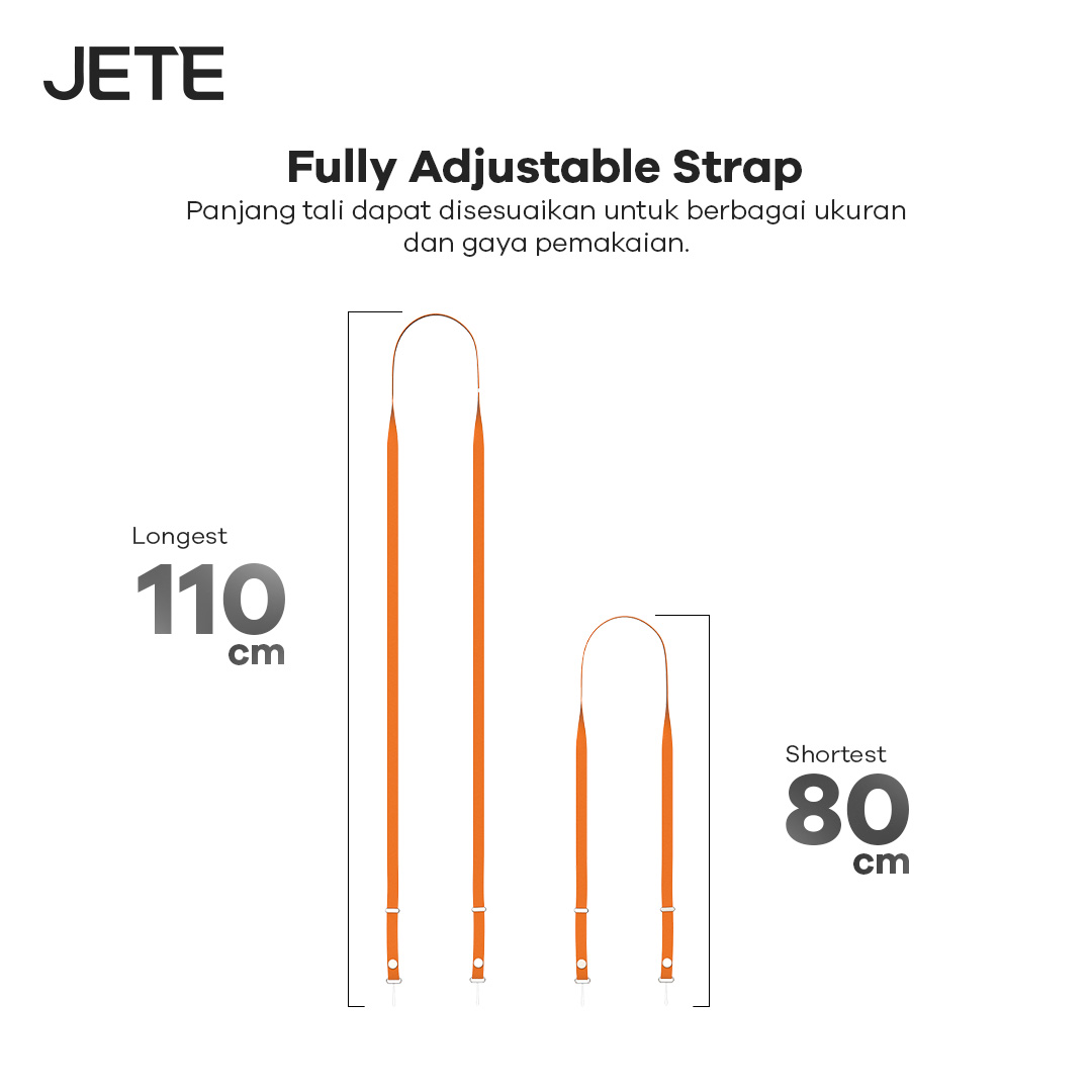 JETE Crossbody Magewave menawarkan fleksibilitas melalui dua mode penggunaan dengan panjang strap yang dapat diatur sesuai kebutuhan. Pengguna bebas mengatur sesuai kebutuhan mulai dari 80 cm hingga 110 cm, sehingga tetap nyaman untuk berbagai postur tubuh.