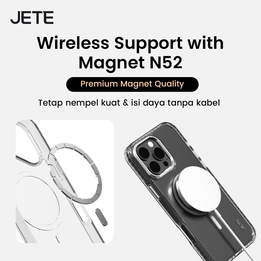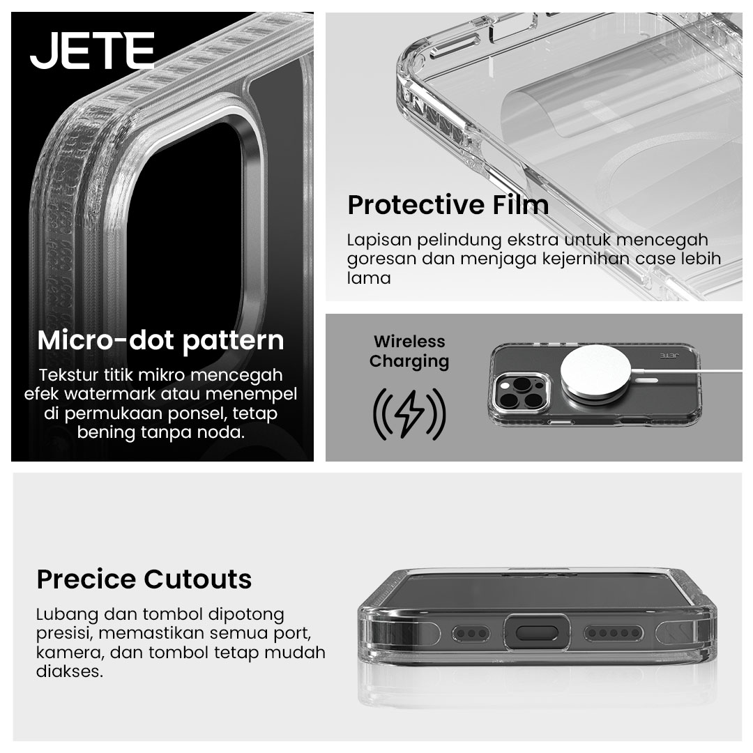 JETE Case iPhone for 16 memberikan perlindungan terbaik pada bodi dan lensa ponsel. Kompatibel untuk iPhone16 Basic, Pro, dan Pro Max. Pemasangannya mudah, memiliki fungsi ganda, dan pengisian tetap optimal. Solusi tepat perlindungan sekaligus tampilan gaya yang elegan sepanjang hari.