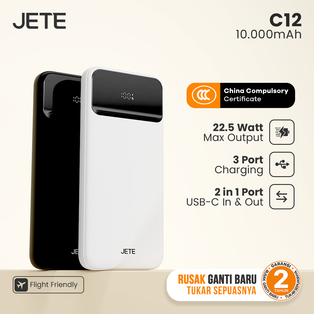 Dirancang untuk kenyamanan dan keamanan, JETE C12 menjadi pilihan tepat bagi pengguna aktif yang membutuhkan powerbank andal saat traveling. Sertifikasi CCC memastikan perangkat ini aman dibawa dan digunakan di Cina tanpa khawatir masalah keamanan.