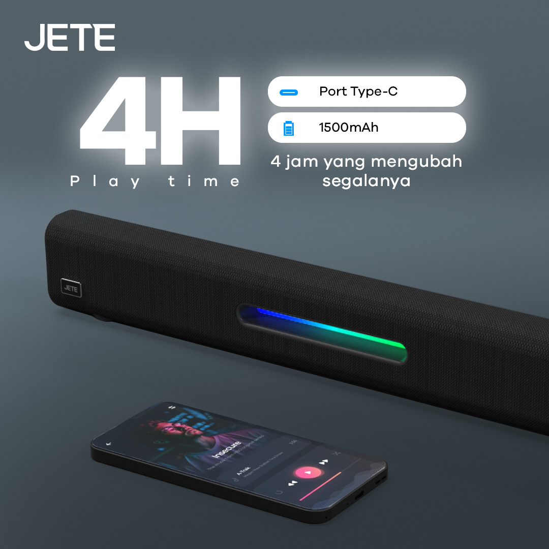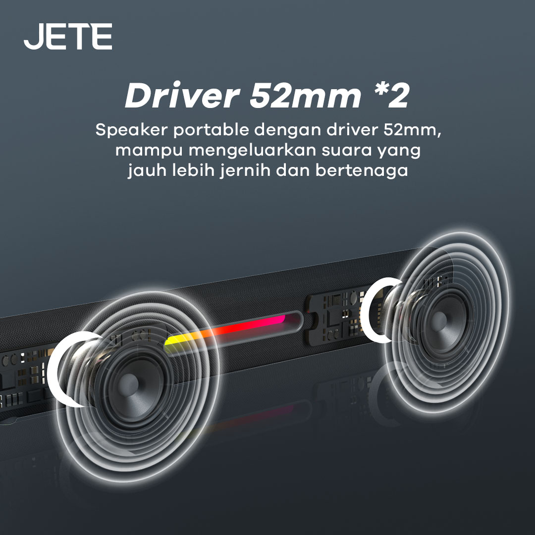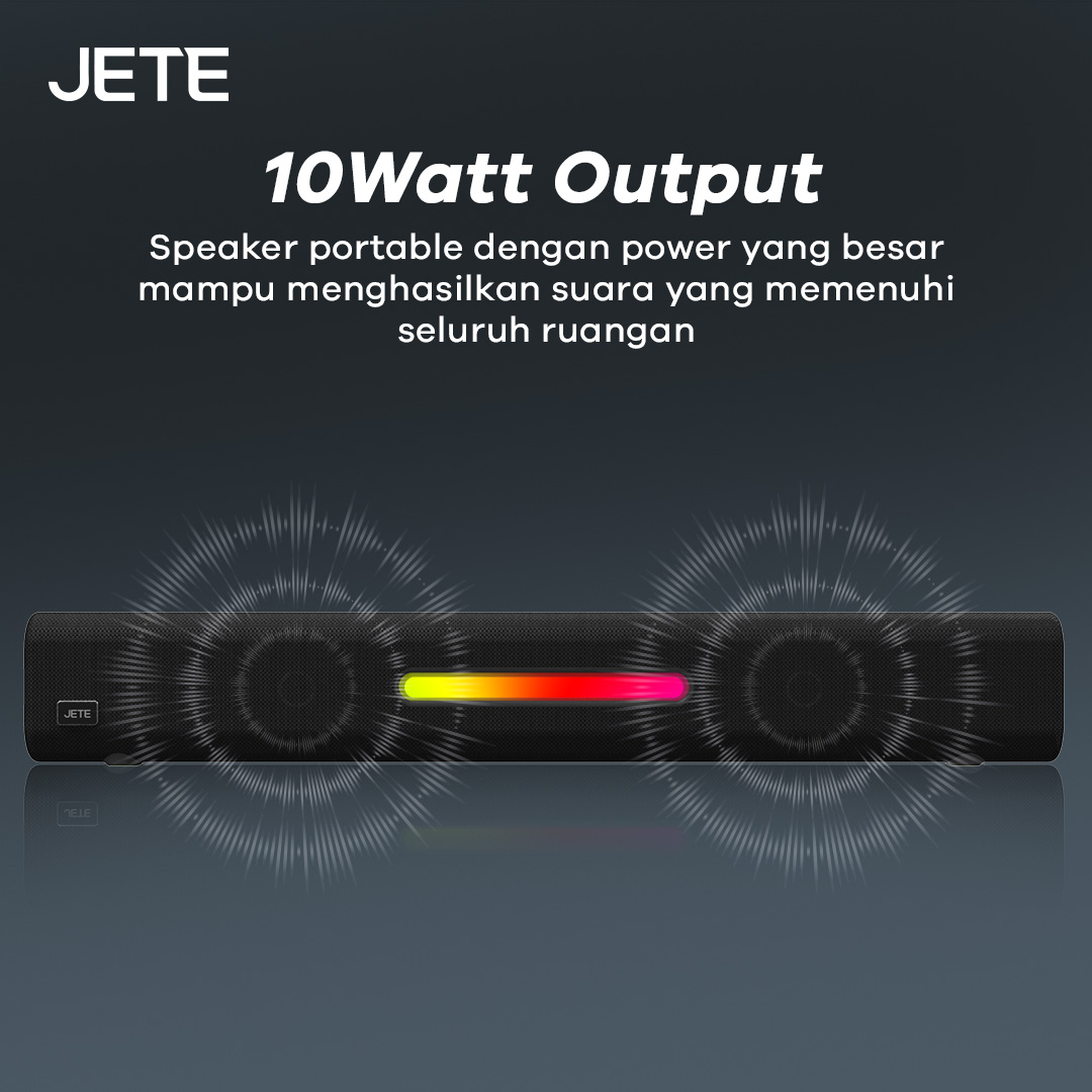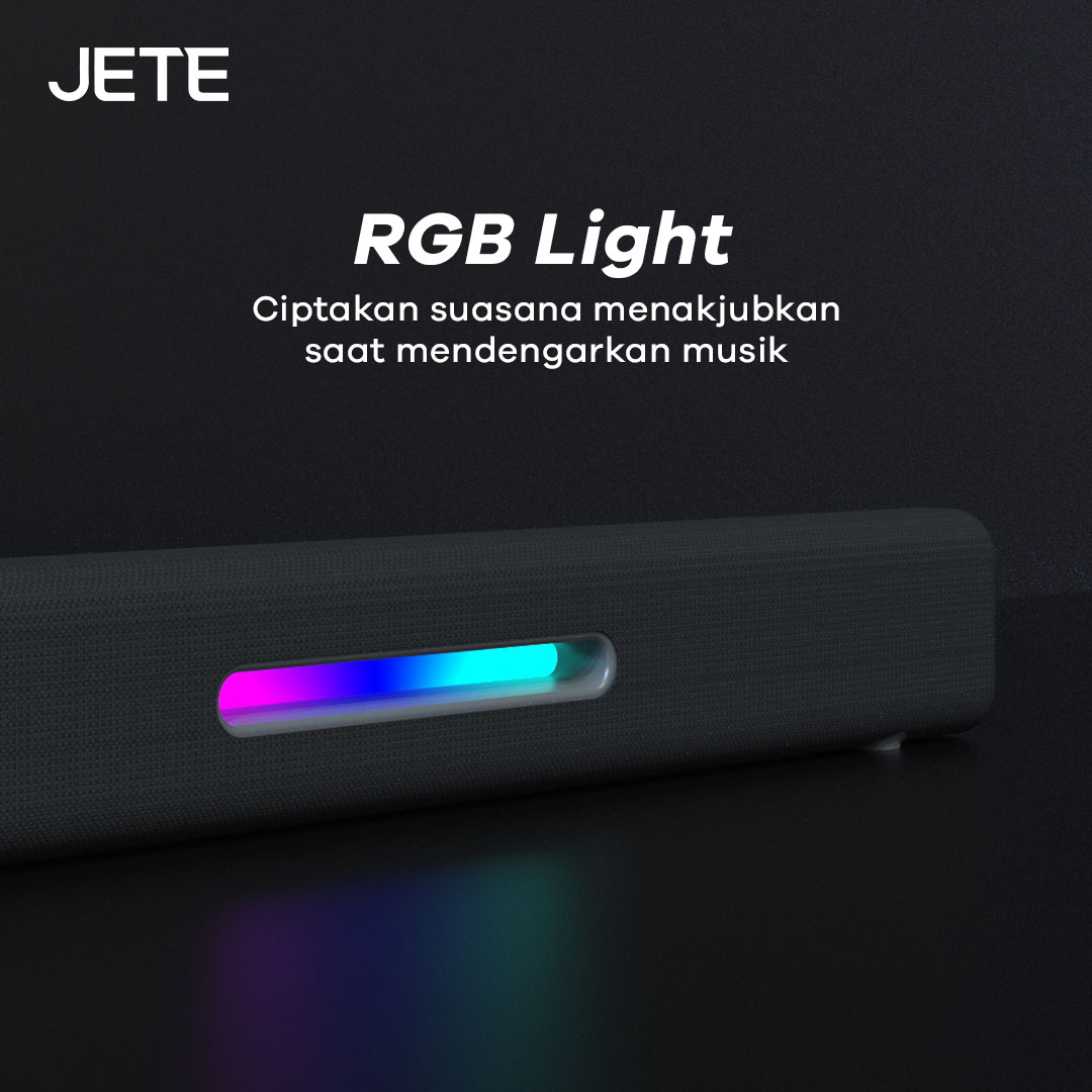 JETE SQ1 adalah speaker Bluetooth dengan desain soundbar yang memukau. Ada enam mode pemutaran, hadirkan audio dengan efek imersif. RGB light yang disematkan membuat tampilannya lebih keren sepanjang hari.