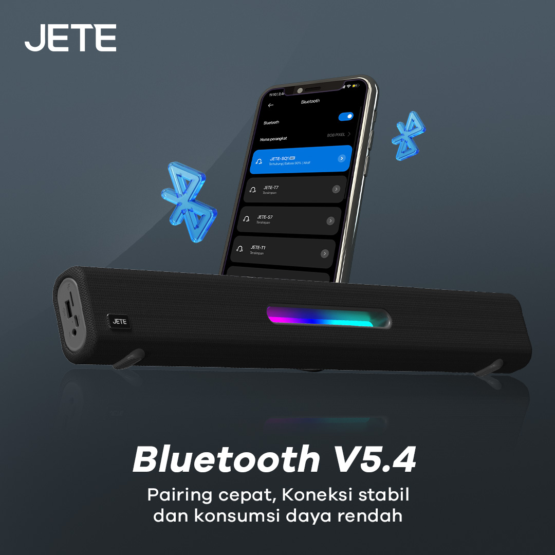 Dukungan teknologi Bluetooth terbaru V5.4 menjadikan proses pairing JETE SQ1 ke perangkat menjadi lebih cepat. Selain itu, koneksinya lebih stabil dan konsumsi dayanya rendah. Sehingga dapat memperpanjang masa pakai baterai.