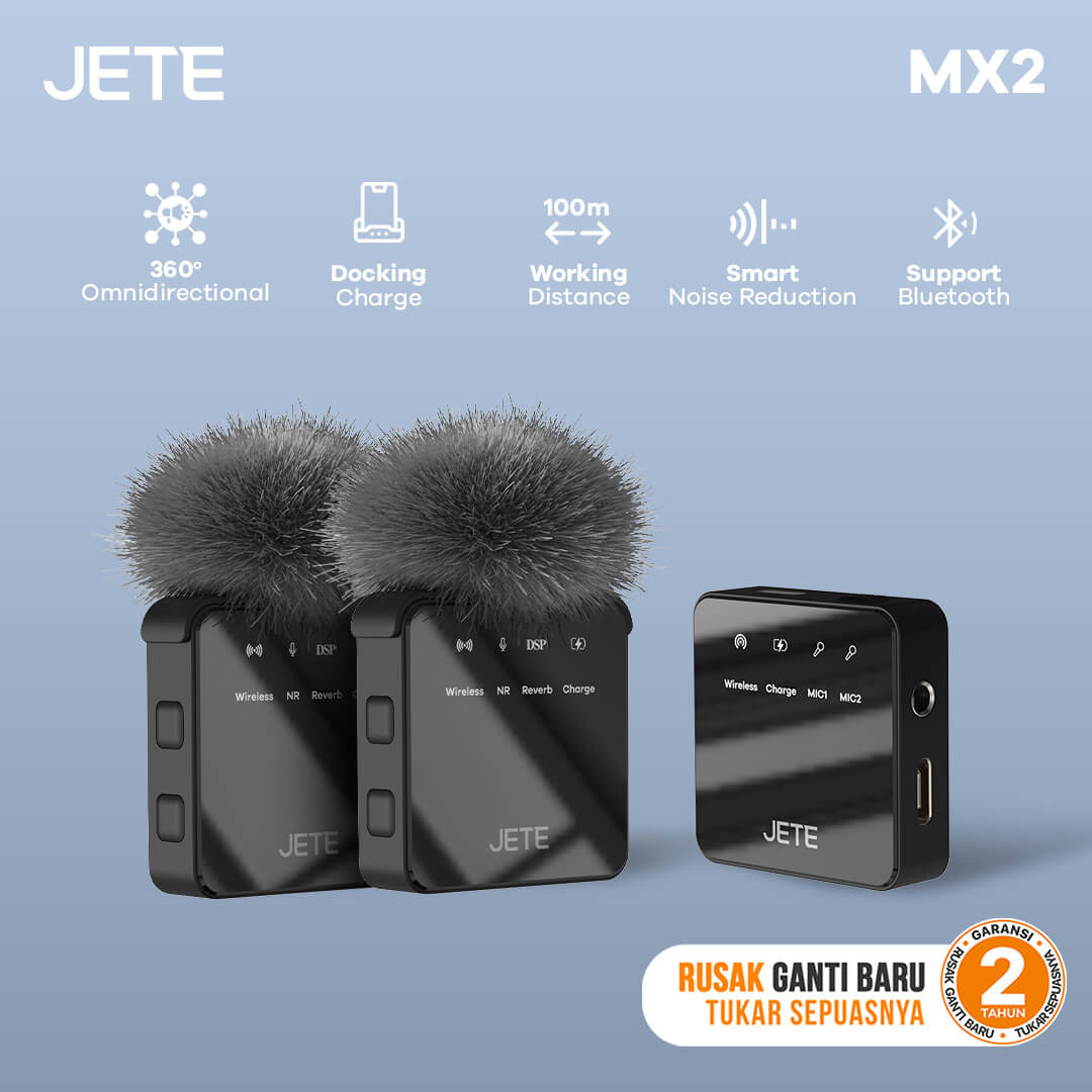 Microphone JETE MX2 Series adalah pilihan tepat untuk bikin konten digital. Dilengkapi dengan fitur peredam kebisingan, koneksi yang lancar, dan mampu menangkap suara lebih baik, menghasilkan audio yang unggul di berbagai kondisi dan situasi.
