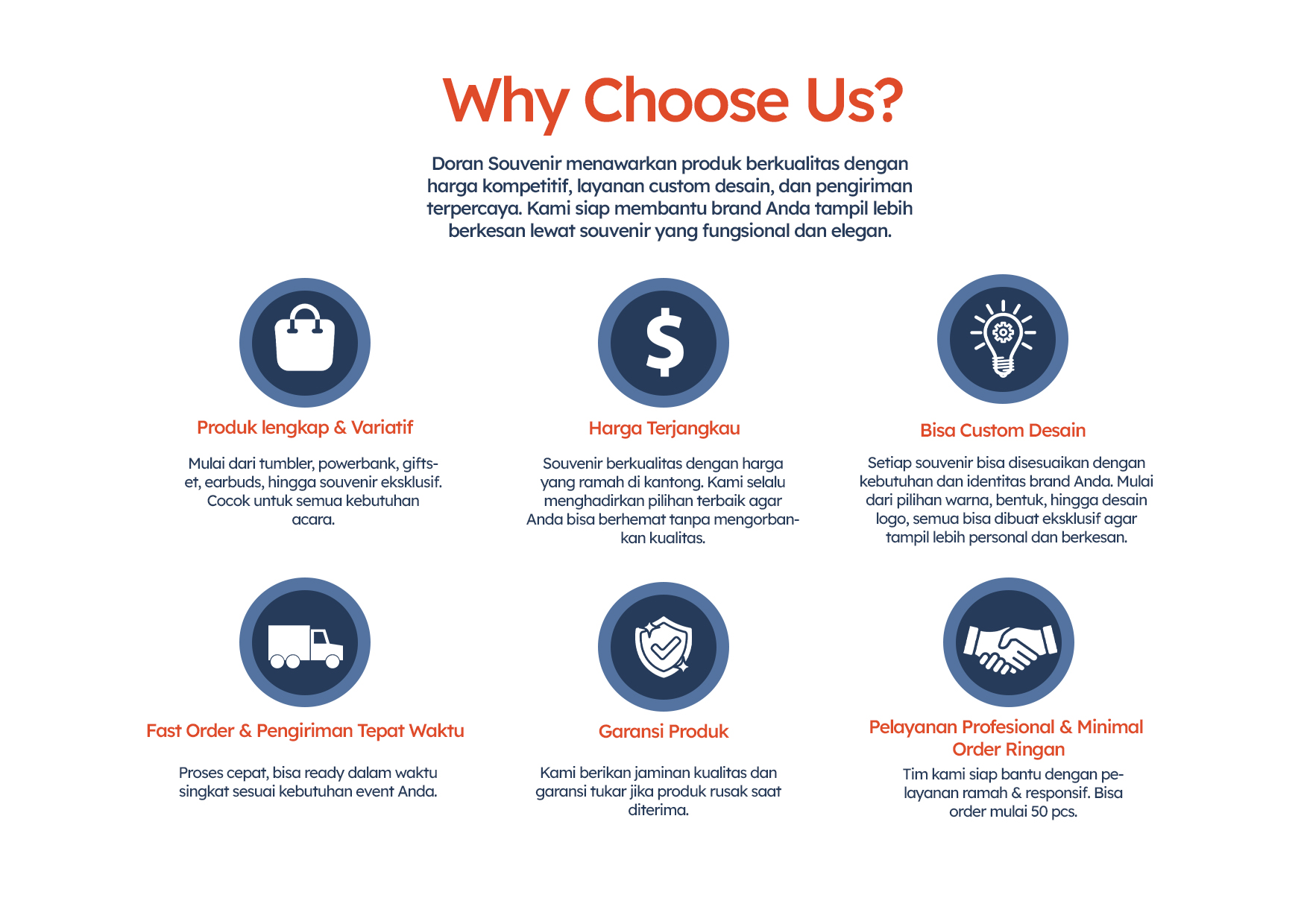 Doran Souvenir menawarkan produk berkualitas dengan harga kompetitif, layanan custom desain, dan pengiriman terpercaya. Kami siap membantu brand Anda tampil lebih berkesan lewat souvenir yang fungsional dan elegan.