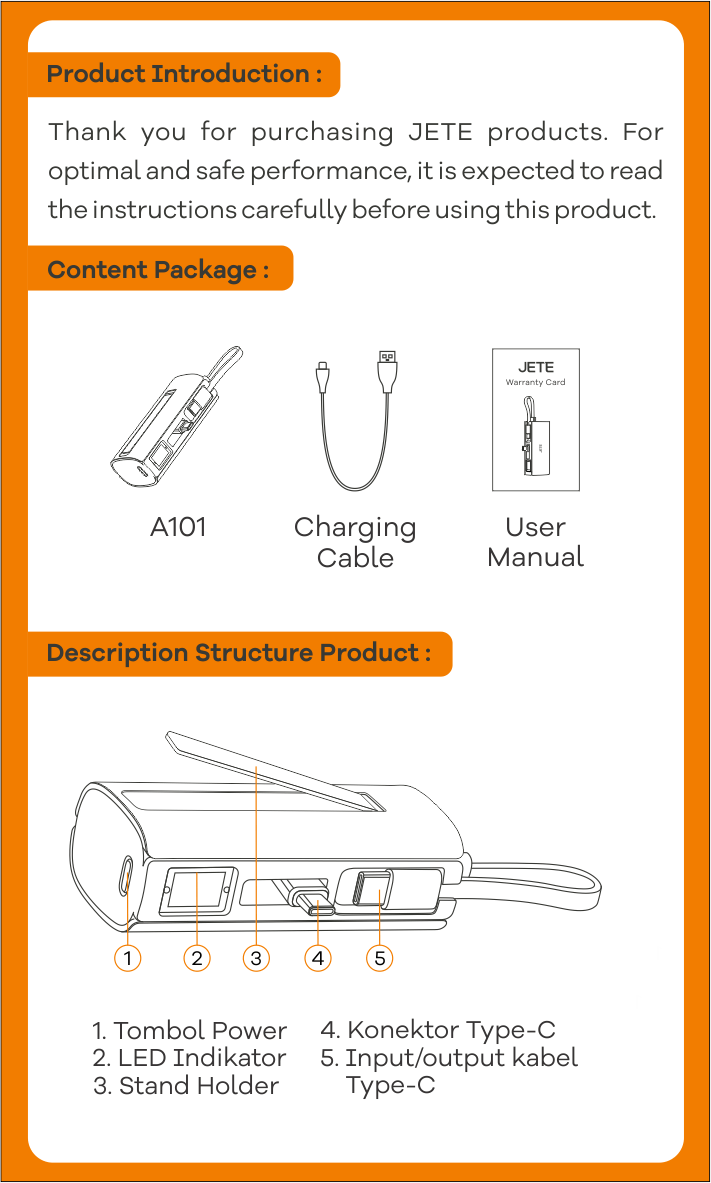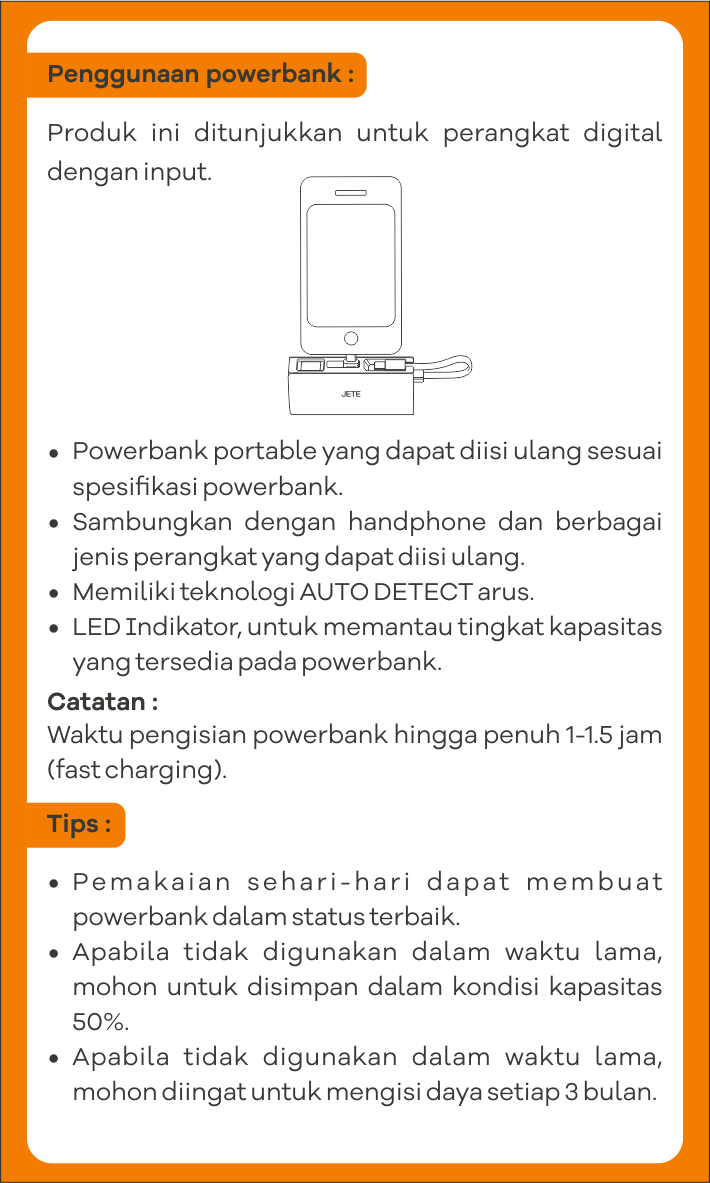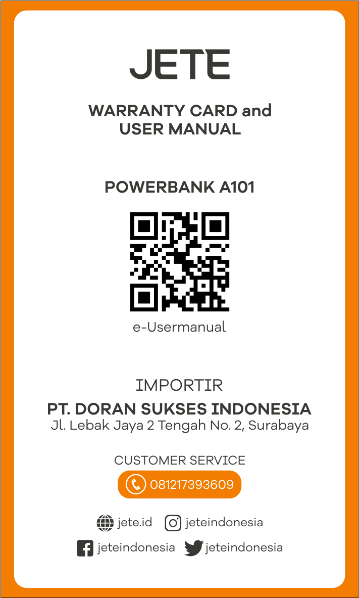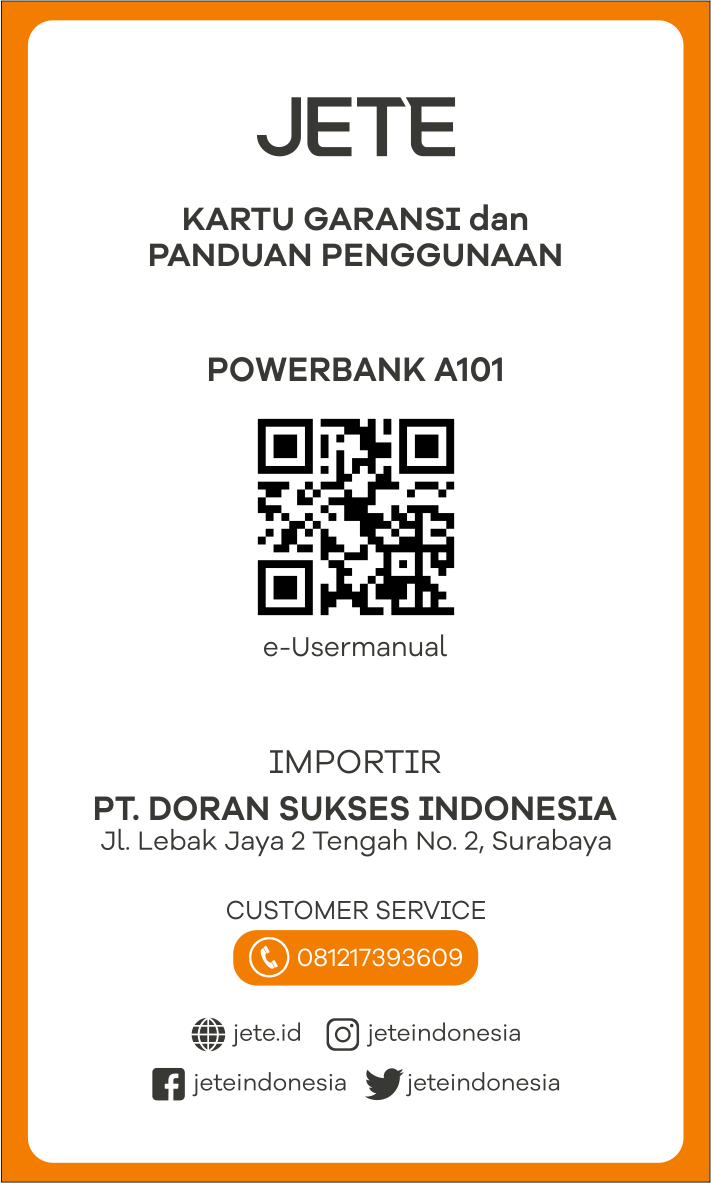 - Kerusakan pada unit Powerbank JETE dapat diajukan klaim garansi dan akan diganti dengan unit baru.