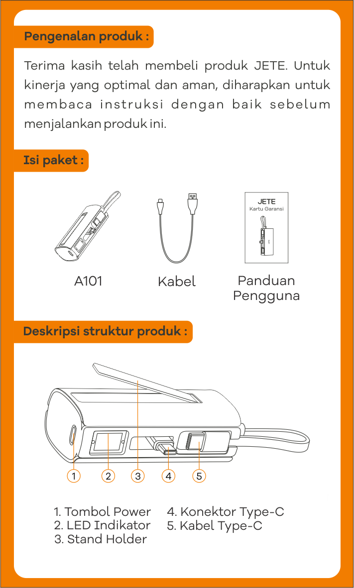 Panduan lengkap penggunaan produk Powerbank JETE A101 untuk memaksimalkan pengalaman pengguna. Dilengkapi instruksi langkah demi langkah, mulai dari instalasi, pengoperasian, hingga pairing.