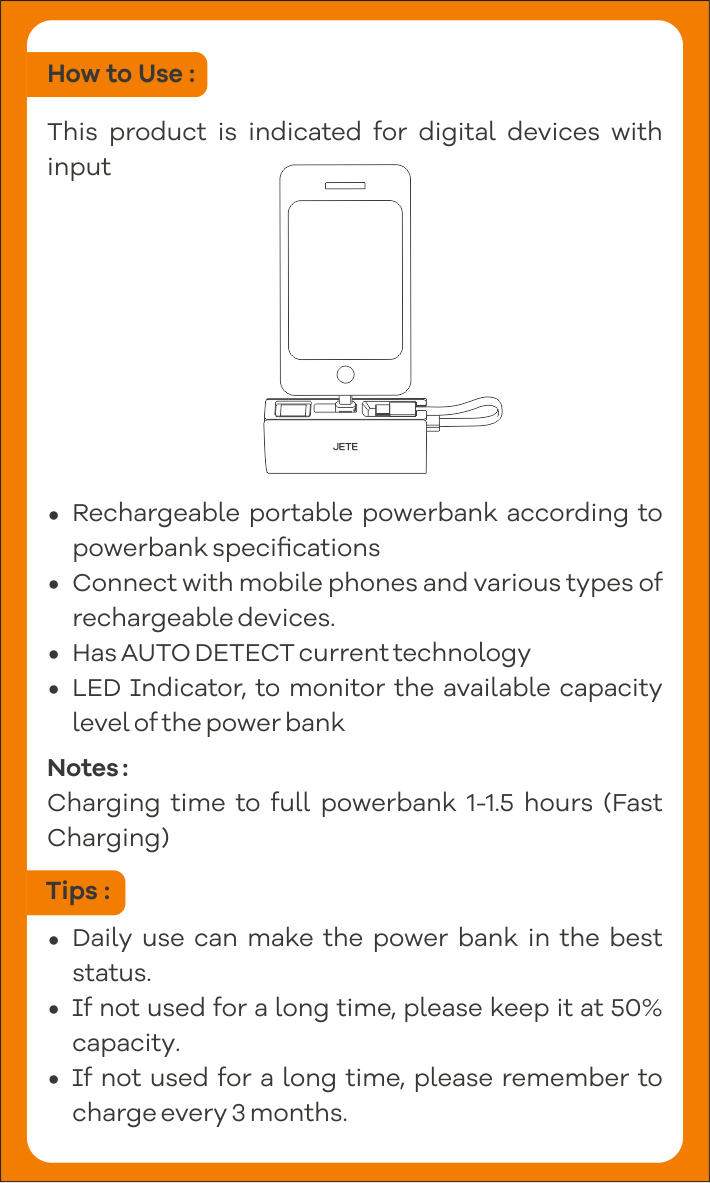 - Damage to the JETE Powerbank unit can be claimed under warranty and will be replaced with a new unit.