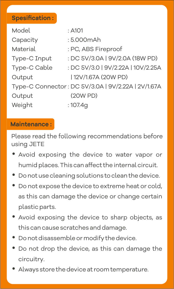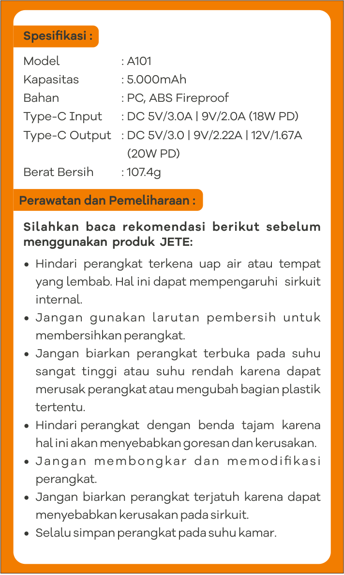 Powerbank JETE A101 dibekali dengan baterai berkapasitas besar 5000mAh. Berkat kapasitas jumbo tersebut menjadikannya sebagai solusi pengisian daya baterai untuk pengguna dengan mobilitas tinggi.