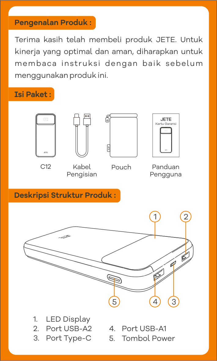 Panduan lengkap penggunaan produk Powerbank JETE PB JETE 10.000 mAh C12 untuk memaksimalkan pengalaman pengguna. Dilengkapi instruksi langkah demi langkah, mulai dari instalasi, pengoperasian, hingga pairing.