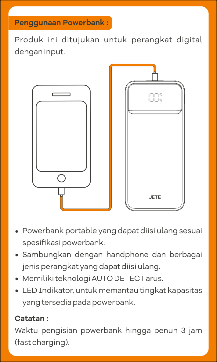 Dengan kapasitas besar 10.000mAh, JETE C12 memungkinkan pengguna aktif tetap produktif sepanjang hari tanpa khawatir kehabisan daya. Powerbank ini juga mampu mengisi berbagai perangkat secara optimal, sehingga tetap bebas bergerak dan menjalani aktivitas harian dengan nyaman.