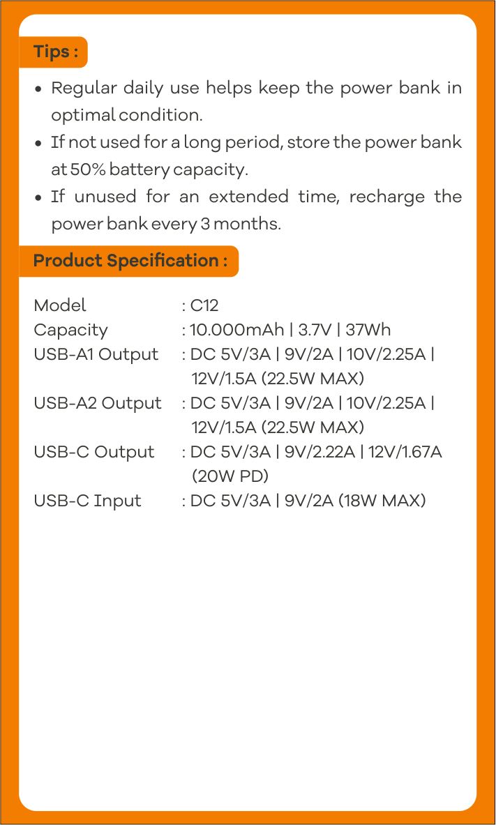 | USB-A2 Output | : DC 5V/3A | 9V/2A | 10V/2.25A | 12V/1.5A (22.5W MAX) |