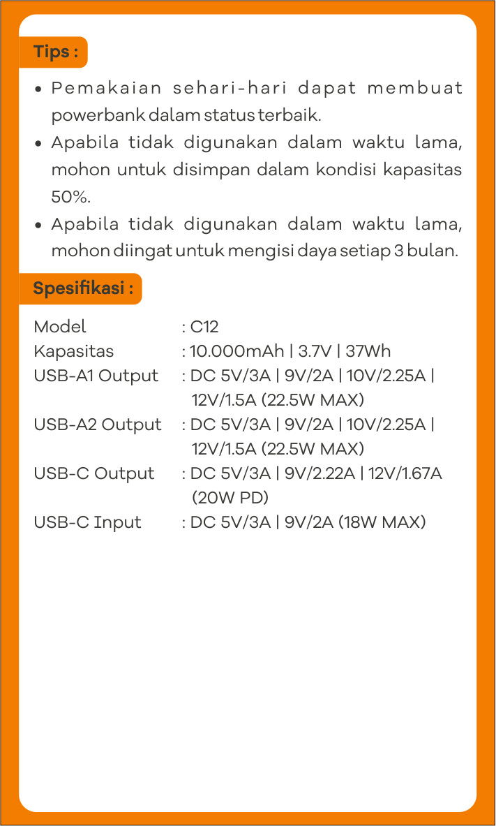 Powerbank ini memiliki port Type-C berfungsi ganda sebagai input dan output, menghadirkan kenyamanan dan fleksibilitas dalam penggunaan. Pengguna dapat mengisi daya kapan saja, baik untuk powerbank maupun perangkat lain, sehingga setiap aktivitas harian tetap berjalan efisien tanpa hambatan.