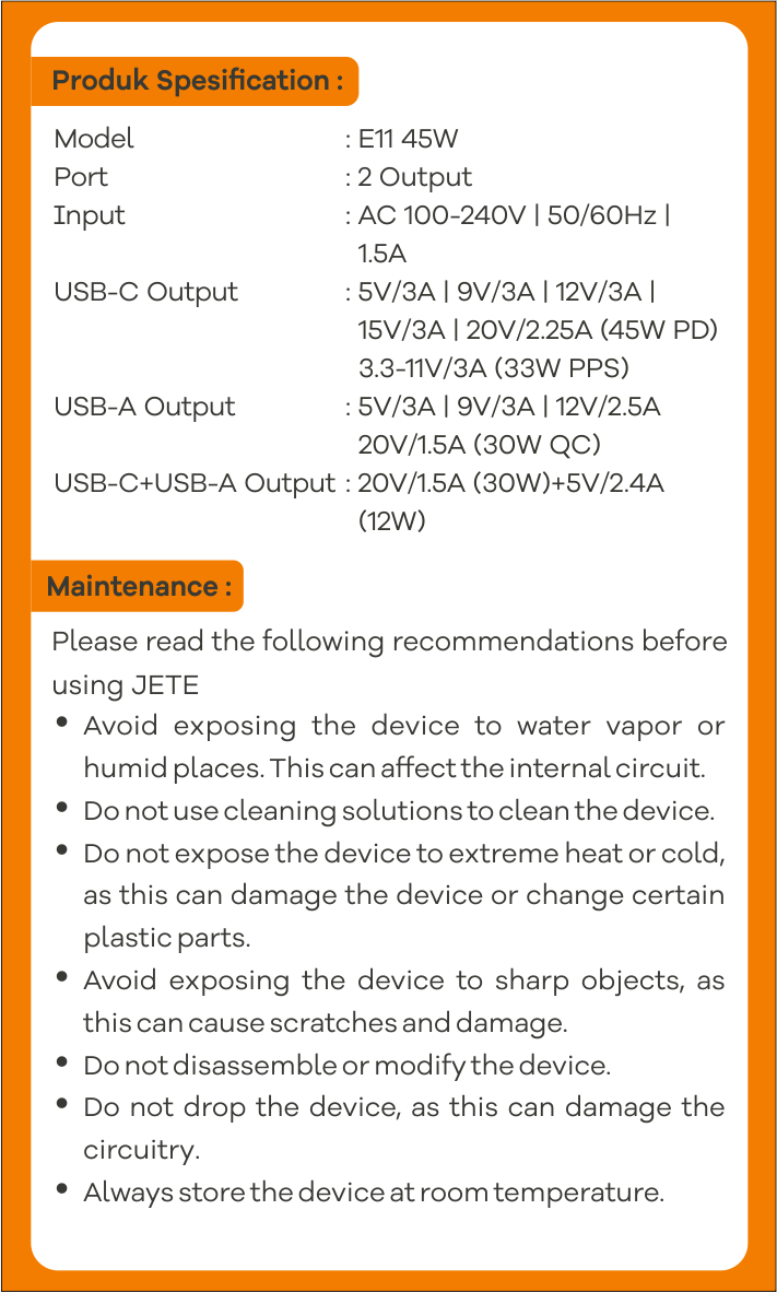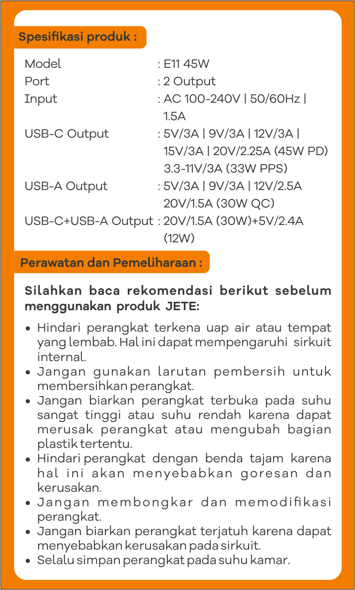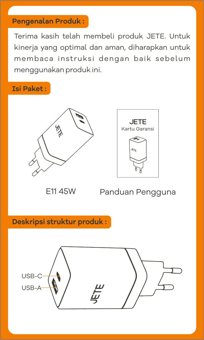 Panduan lengkap penggunaan produk Charger JETE E11 45W USB A+C untuk memaksimalkan pengalaman pengguna. Dilengkapi instruksi langkah demi langkah, mulai dari instalasi, pengoperasian, hingga pairing.