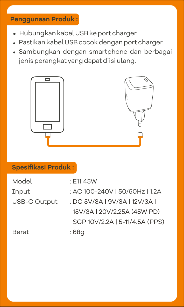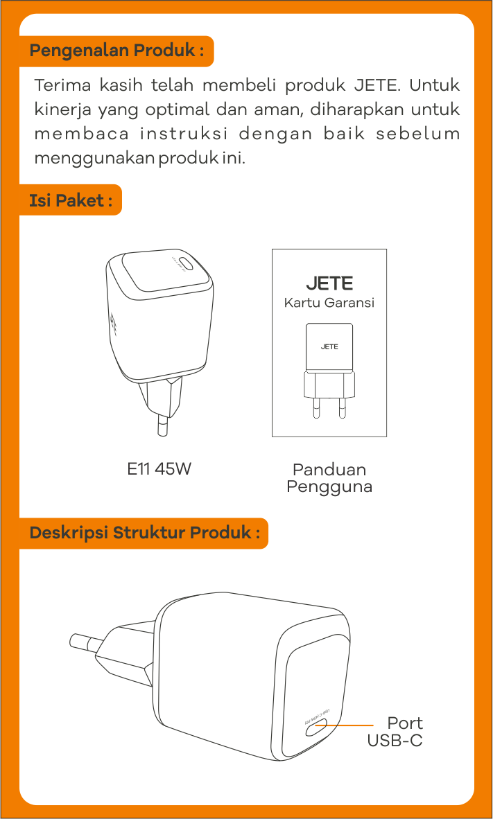 Panduan lengkap penggunaan produk Charger JETE E11 45W C untuk memaksimalkan pengalaman pengguna. Dilengkapi instruksi langkah demi langkah, mulai dari instalasi, pengoperasian, hingga pairing.