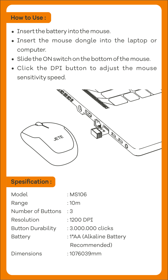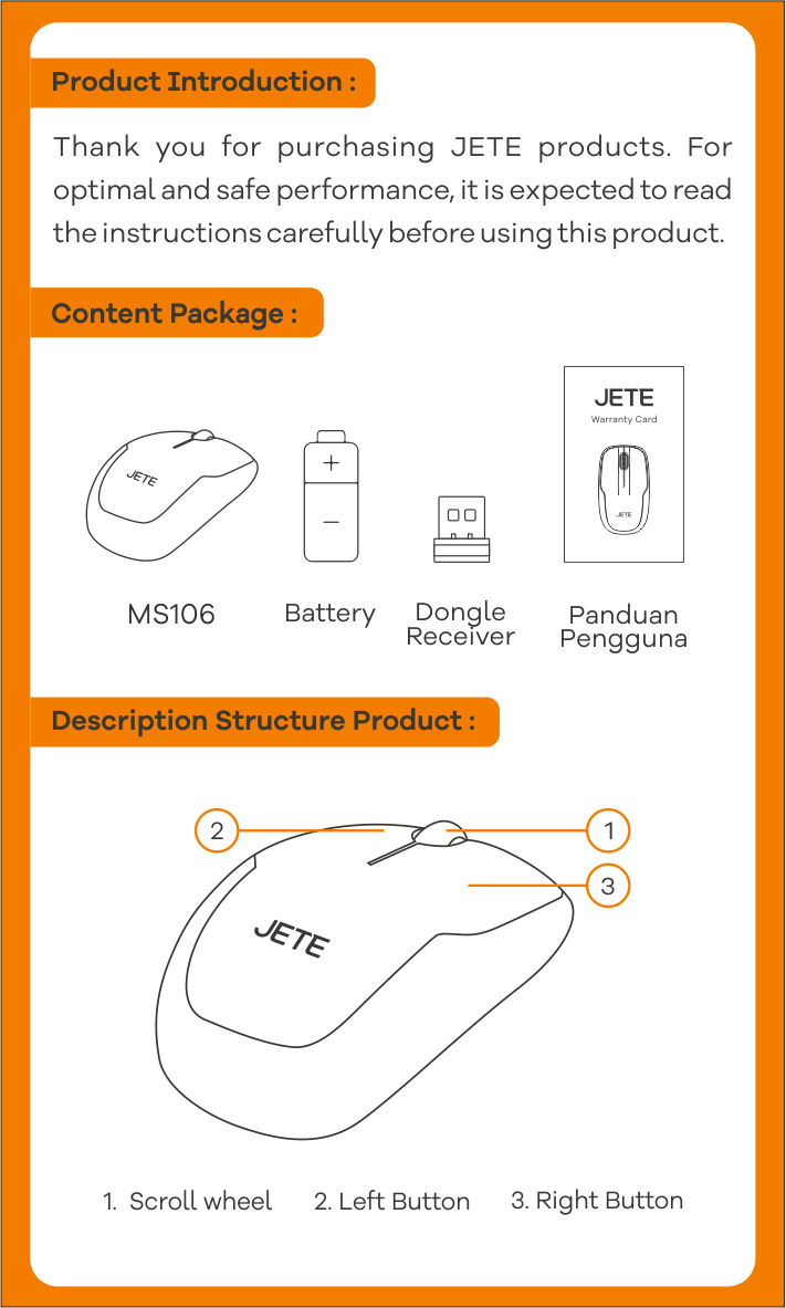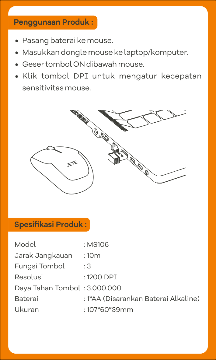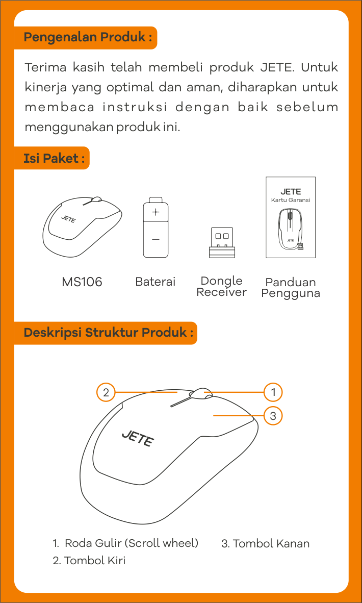Panduan lengkap penggunaan produk Mouse JETE MS106 untuk memaksimalkan pengalaman pengguna. Dilengkapi instruksi langkah demi langkah, mulai dari instalasi, pengoperasian, hingga pairing.