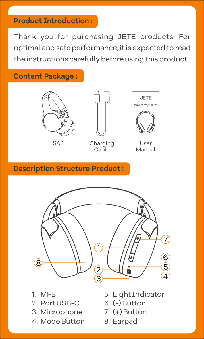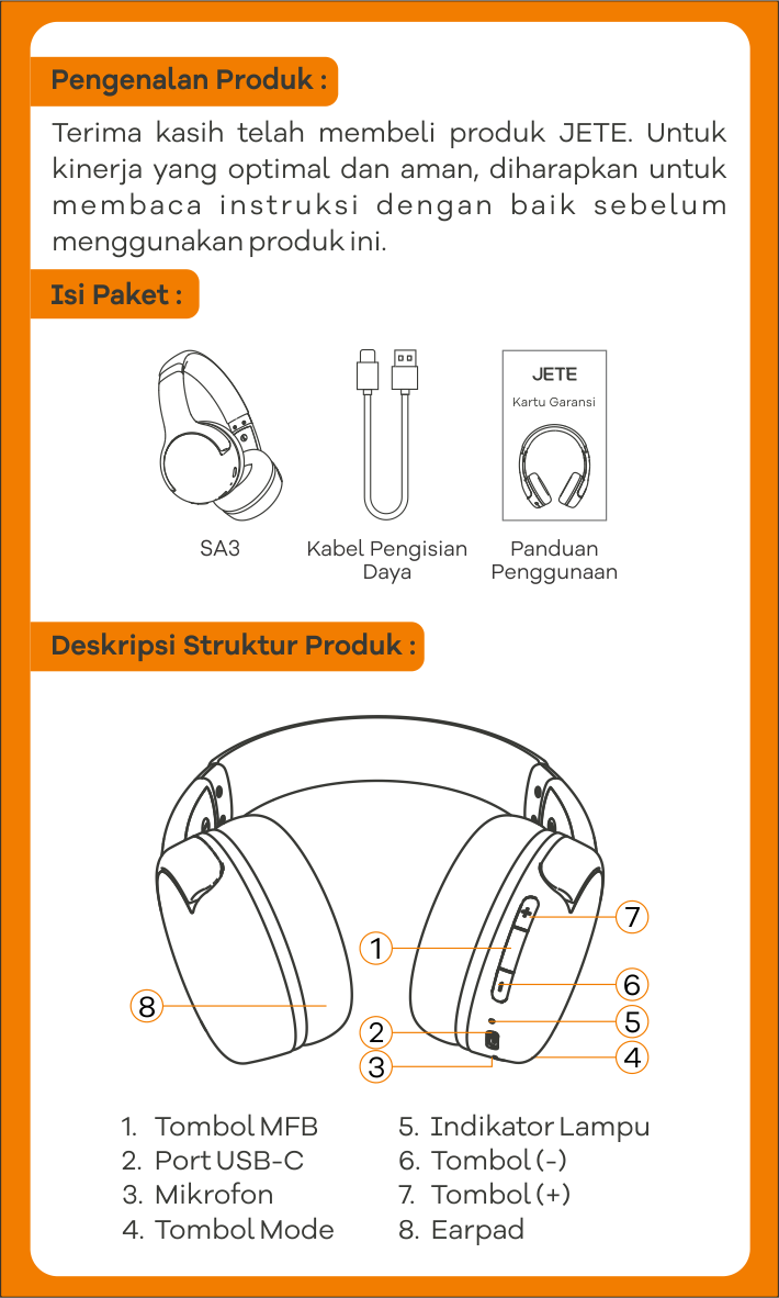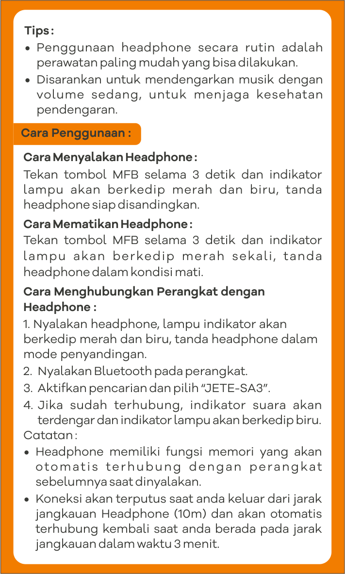 Panduan lengkap penggunaan produk Bluetooth Headphone JETE SA3 untuk memaksimalkan pengalaman pengguna. Dilengkapi instruksi langkah demi langkah, mulai dari instalasi, pengoperasian, hingga pairing.