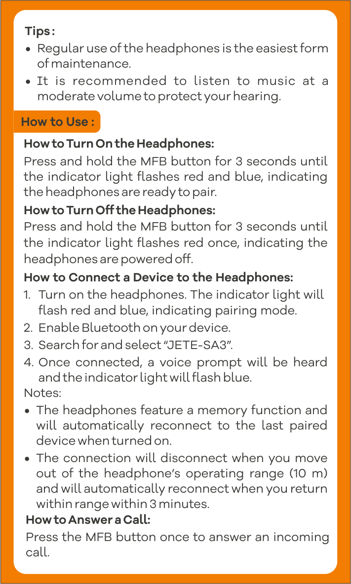Menggunakan desain yang ergonomis dan simpel, membuat headphone Bluetooth ini nyaman dipakai dalam waktu lama. Hal tersebut karena headband JETE SA3 dirancang mengikuti lingkar kepala dan mudah disesuaikan.