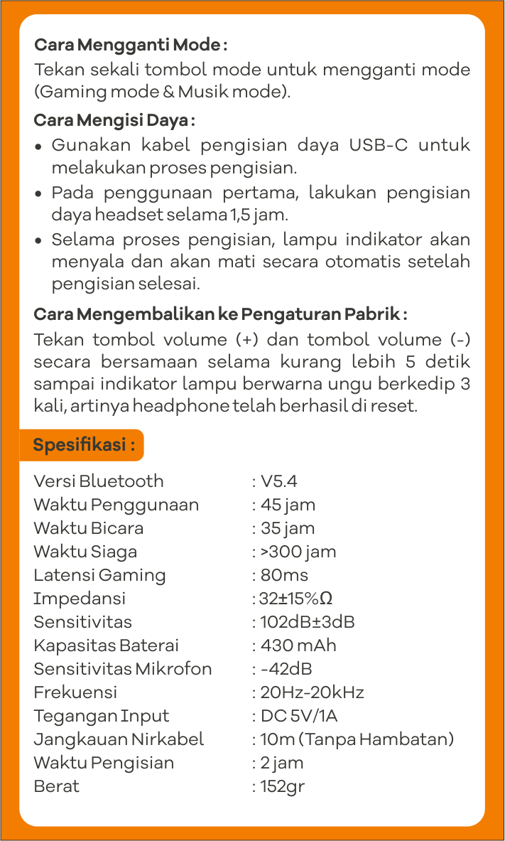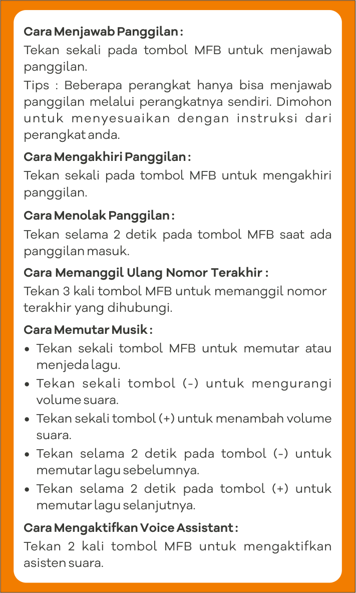 Didukung baterai berkapasitas besar dengan 45 jam playtime, 35 jam talktime, dan 300 jam standby, kamu bisa menikmati audio lebih lama tanpa harus sering mengisi daya baterai. Untuk pemakaian terbaik, atur volume di level normal atau sekitar 50%.
