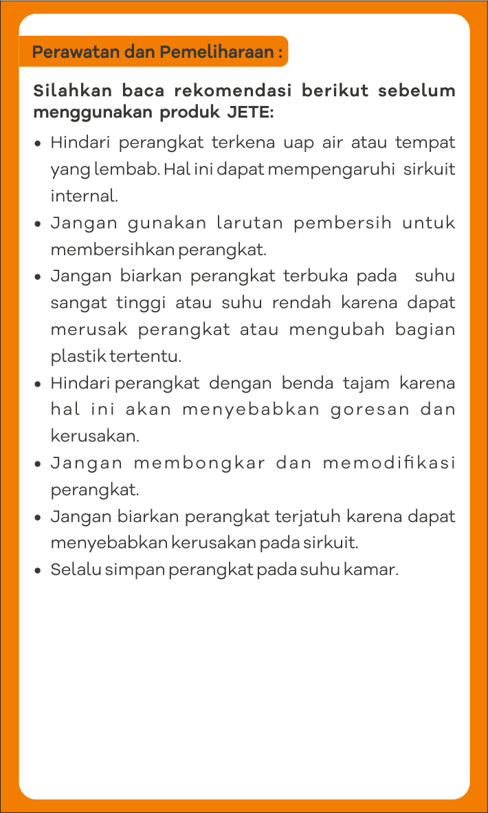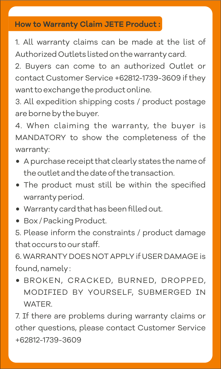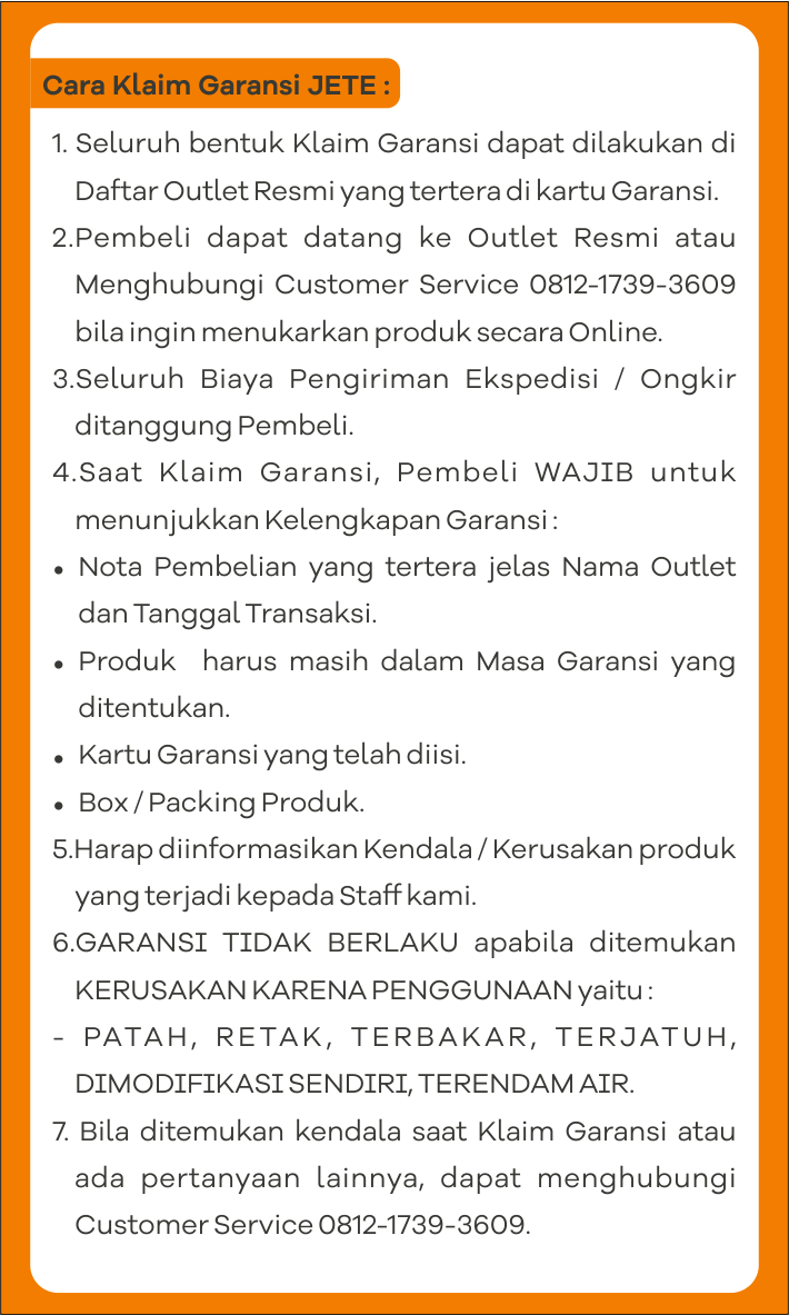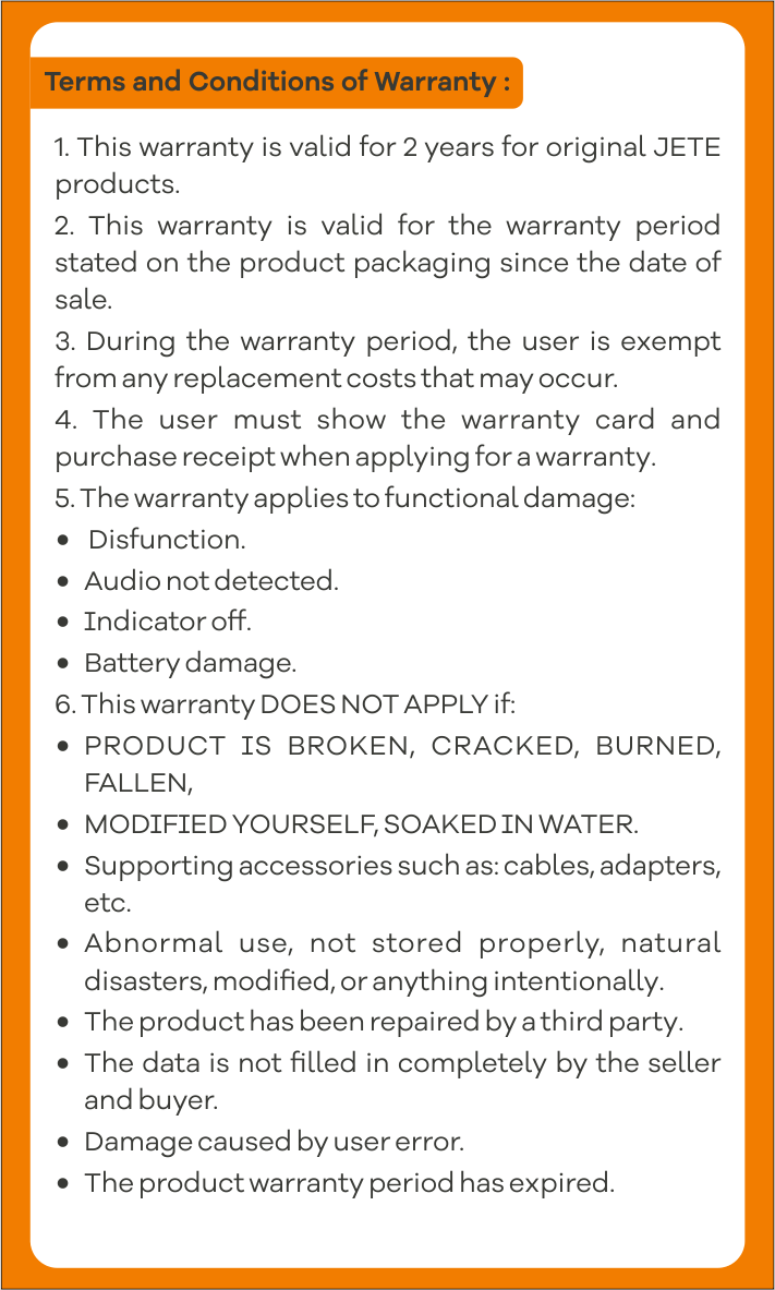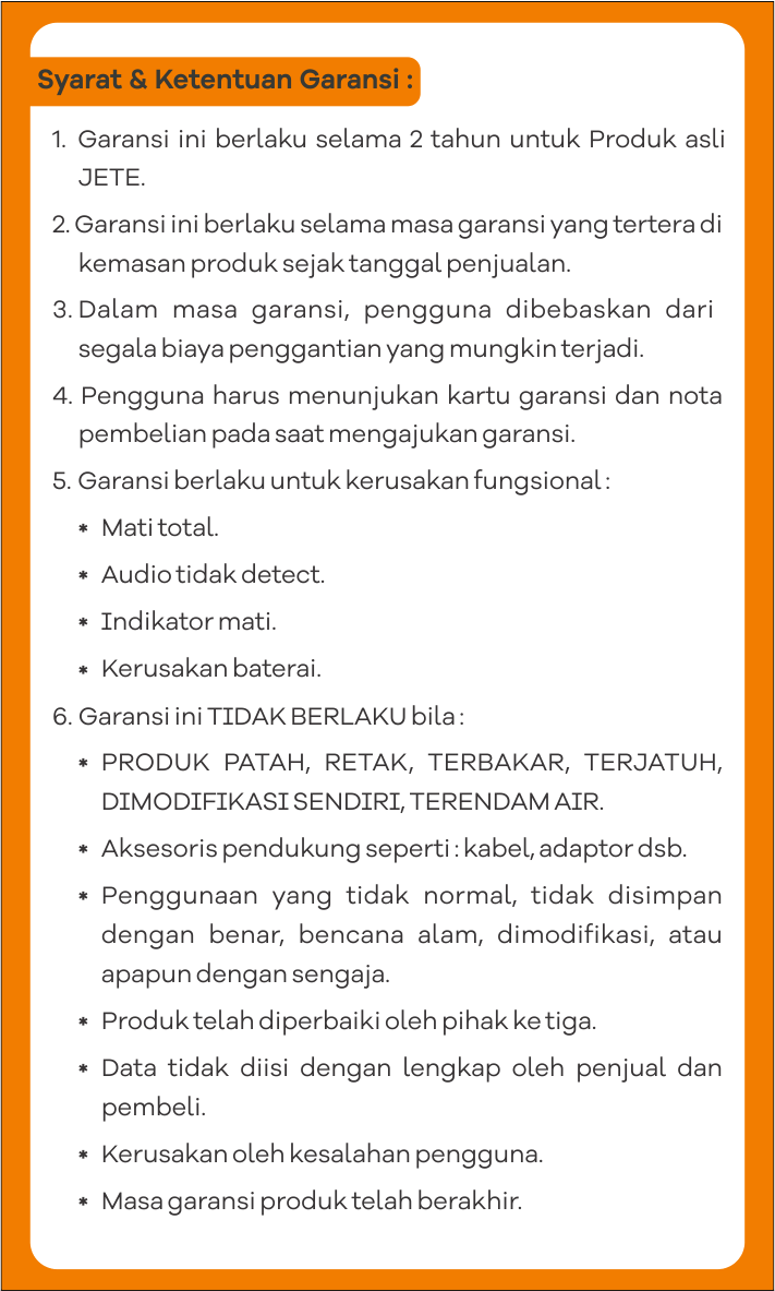 - Klaim Garansi Service hanya berlaku untuk unit utama speaker JETE SB1 / SB2.