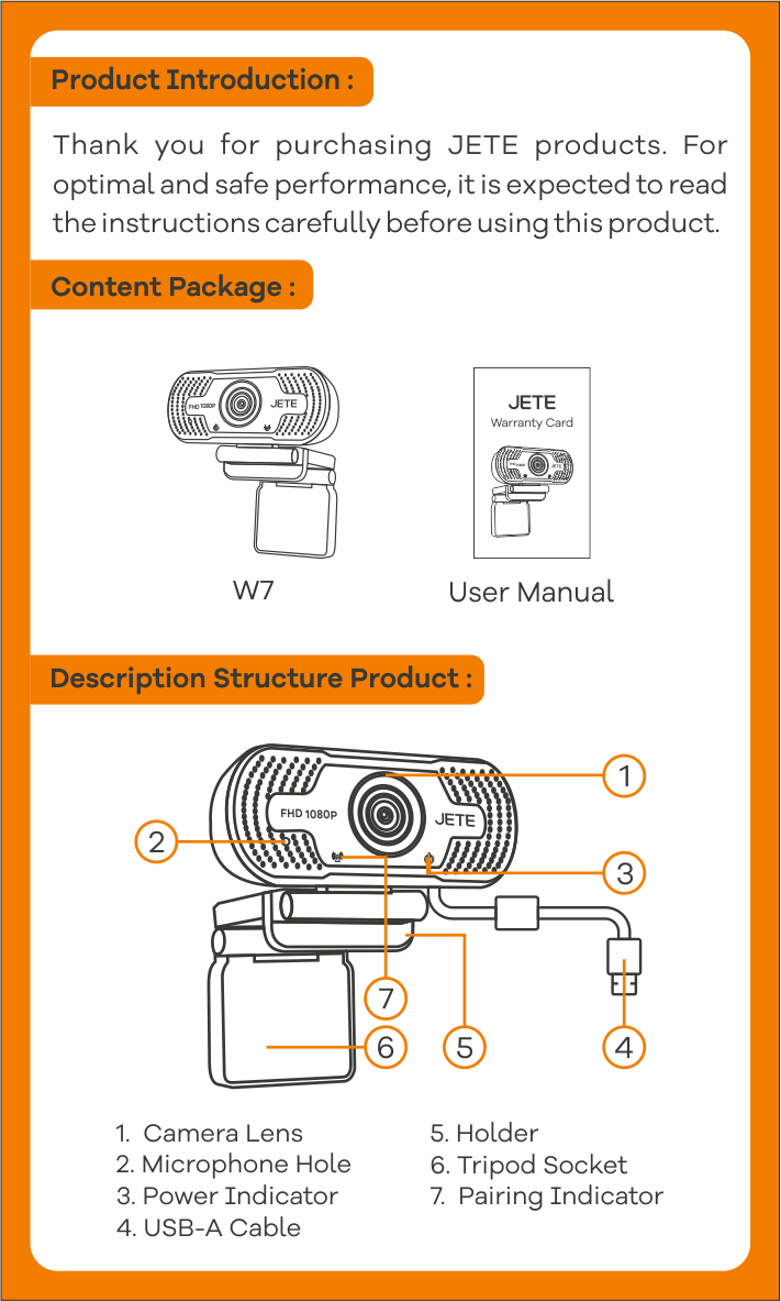 Panduan lengkap penggunaan produk Webcam JETE W7 untuk memaksimalkan pengalaman pengguna. Dilengkapi instruksi langkah demi langkah, mulai dari instalasi, pengoperasian, hingga pairing.