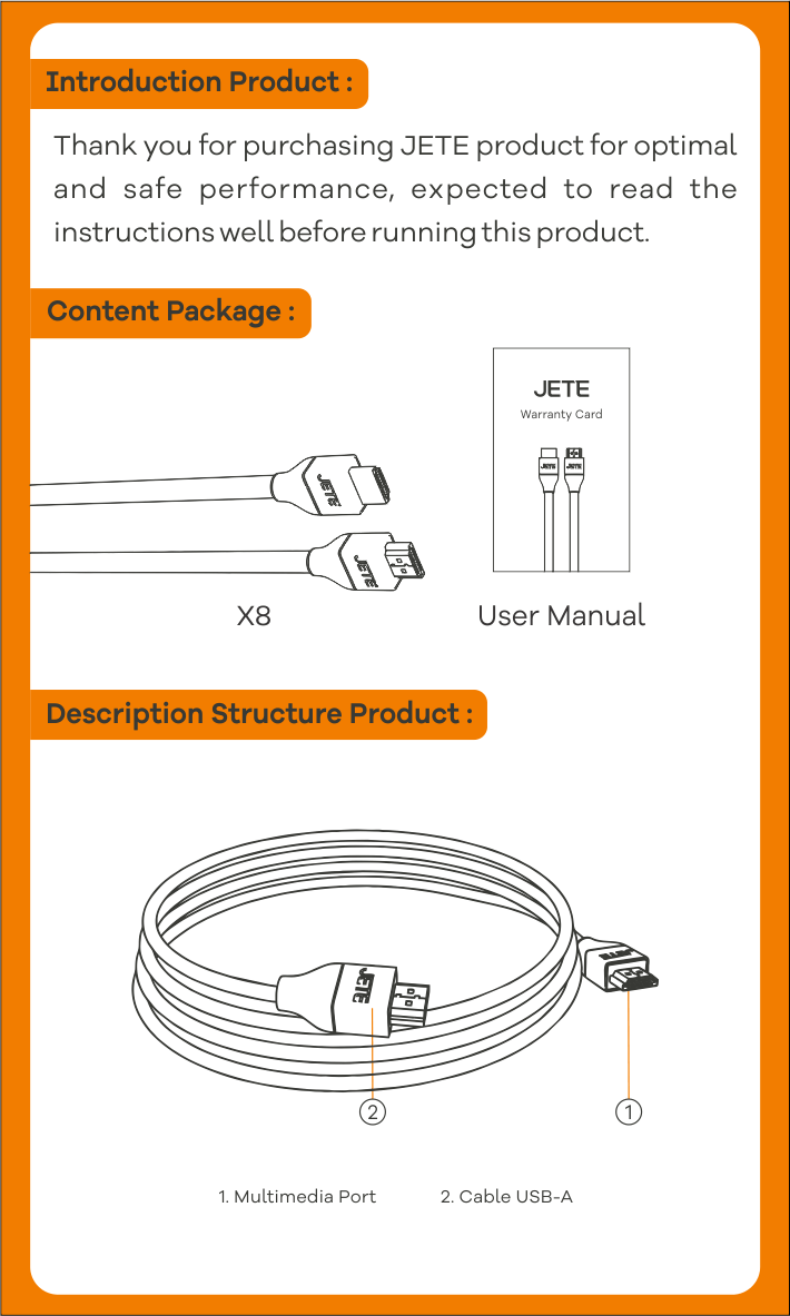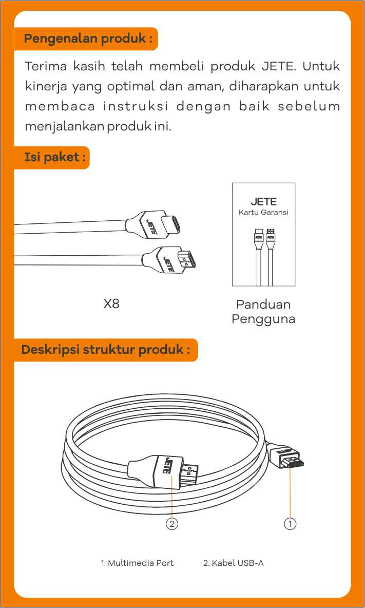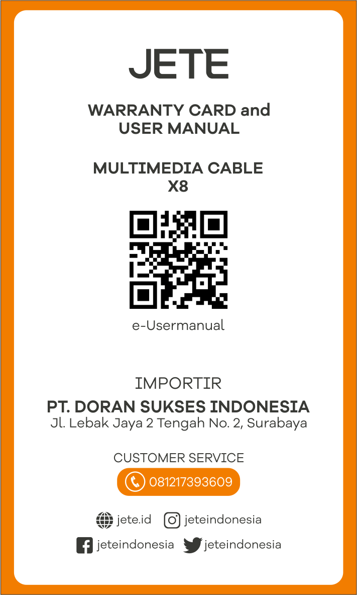 Kabel Multimedia to Multimedia JETE X8 Series dirancang dengan desain yang ringkas, mudah dibawa ke mana saja, dan mudah digulung. Dengan bahan material terbaik, membuatnya dapat digunakan di berbagai kondisi. Termasuk untuk penggunaan yang memerlukan kinerja tinggi sekalipun.