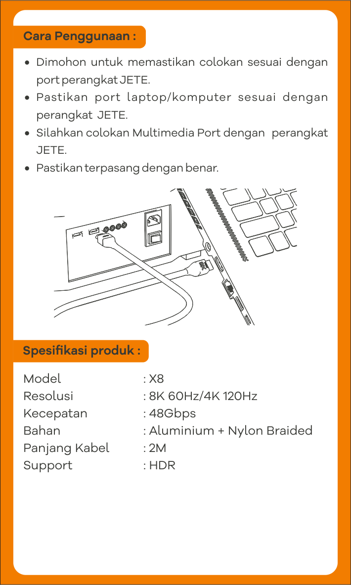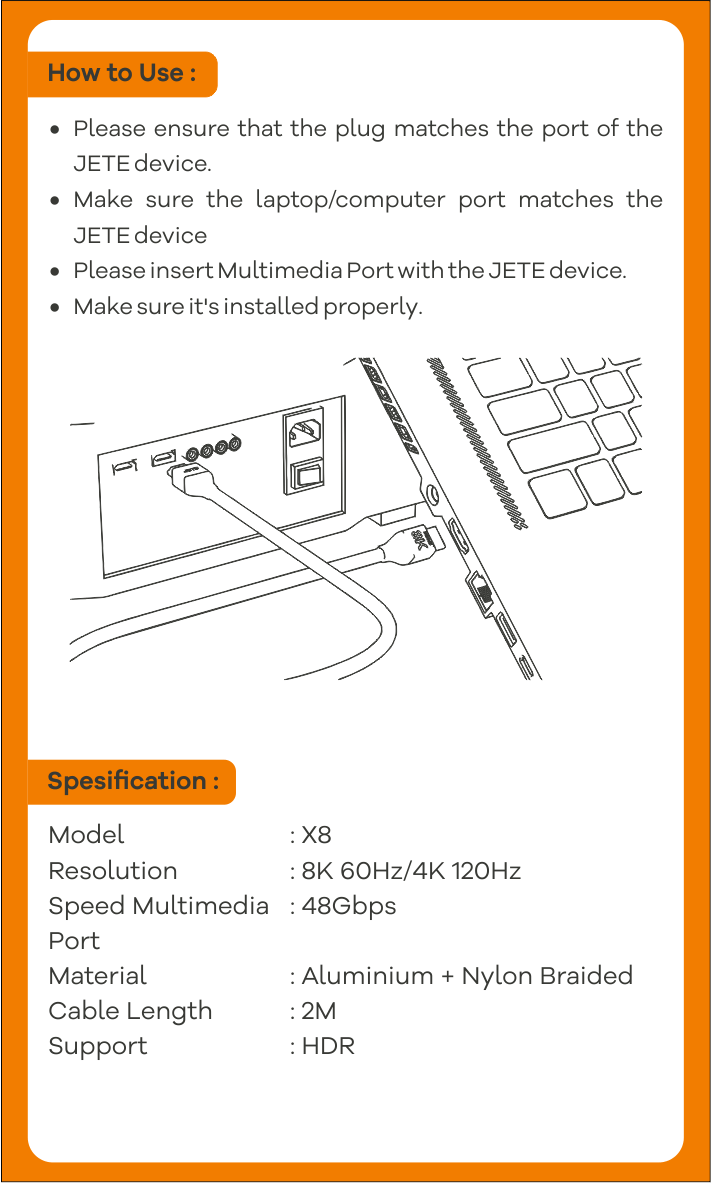 Kabel Multimedia JETE X8 Series dapat digunakan di berbagai perangkat dan untuk berbagai keperluan, baik untuk keperluan yang mendukung pekerjaan maupun untuk entertainment. Beberapa perangkat yang kompatibel ini di antaranya adalah monitor, desktop, proyektor, dan lainnya.