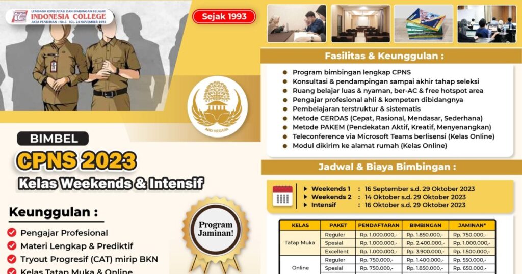 Indonesia College adalah lembaga bimbingan belajar online berpengalaman sejak 1993. Mereka menawarkan bimbingan belajar CPNS Online dengan sistem VICON yang terpadu. Salah satu keunggulan mereka adalah modul soal Higher Order Thinking Skills (HOTS). Mereka juga menawarkan garansi Jaminan Lulus Tes dan tryout dibimbing oleh pengajar berpendidikan S1 dan S2. Kelas yang mereka sediakan bersifat eksklusif dengan jumlah peserta terbatas.